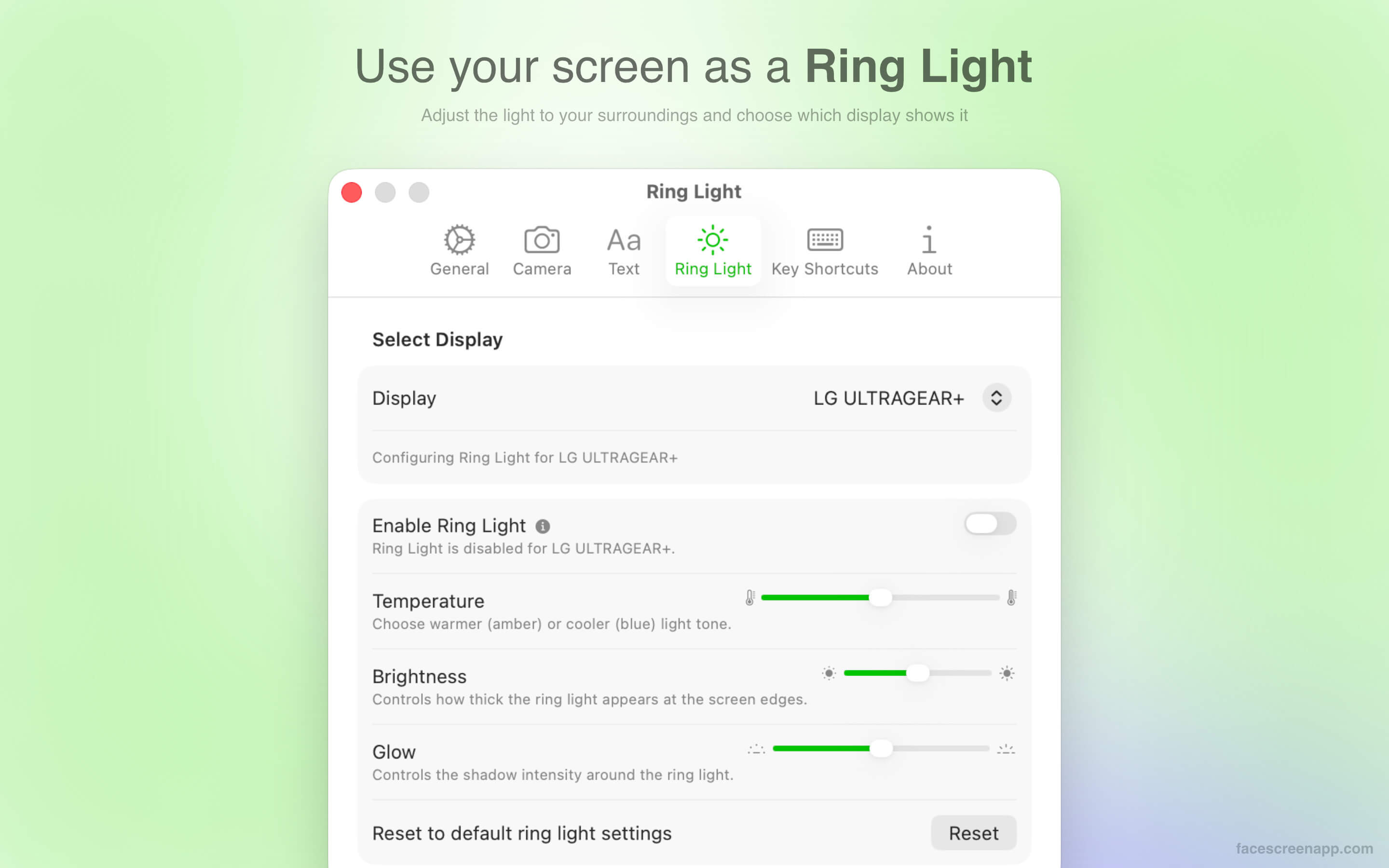 Ring Light turns your display into a soft wash of light so you look better on camera without a physical ring. It fades out of the way when you hover over it, and you can dial in temperature, brightness, and glow to match the room.